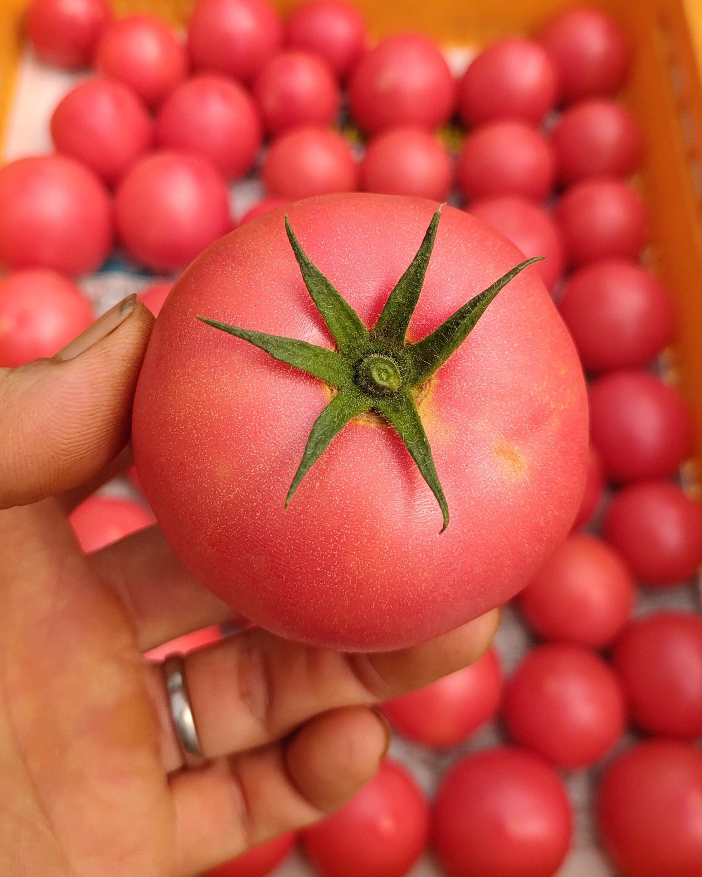 ・一般流通している物とは異なる、トマト本来の美味しさをお届けしたいと言う思いから樹で赤く熟してから収穫を行い、樹熟トマトの状態で発送させて頂きます